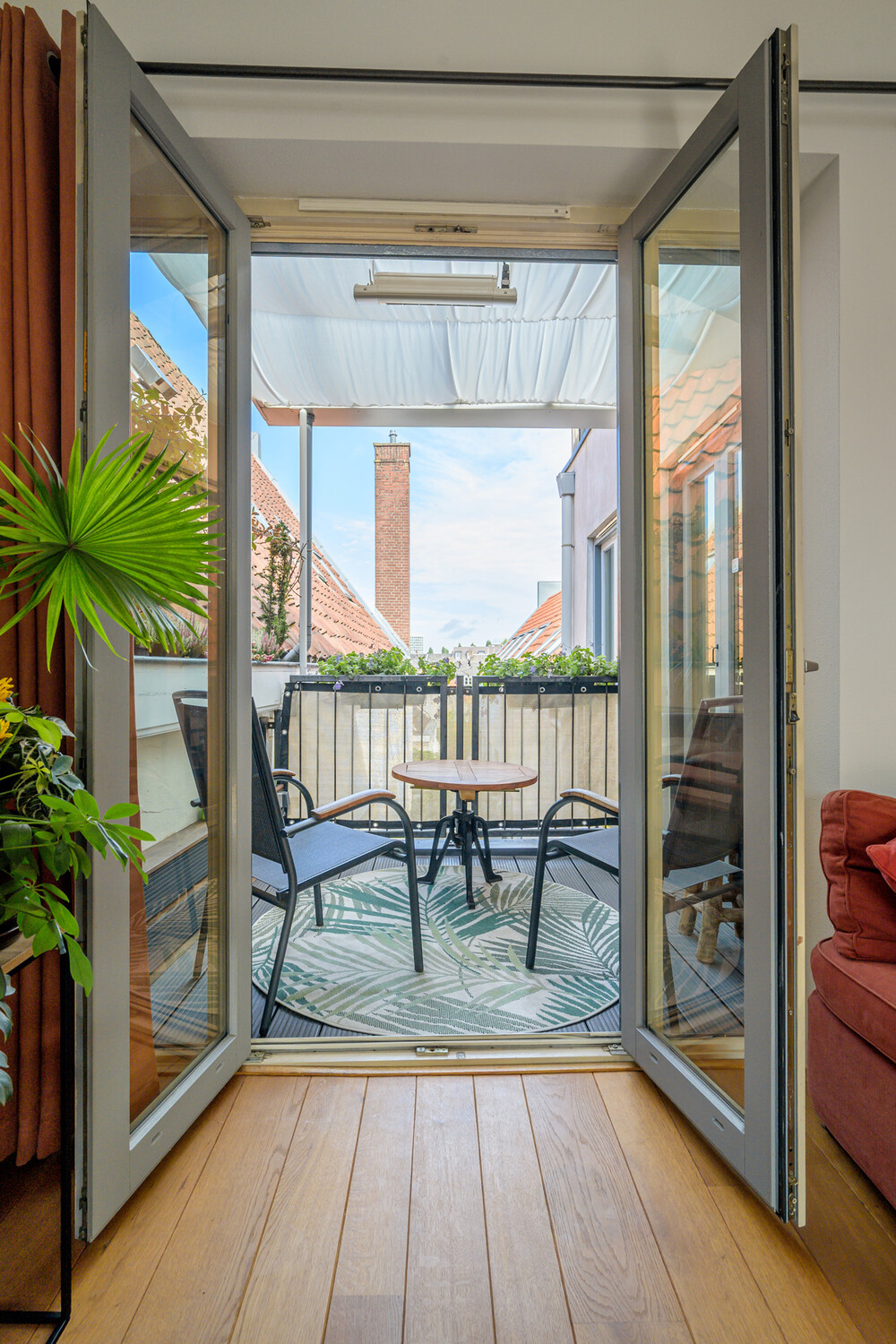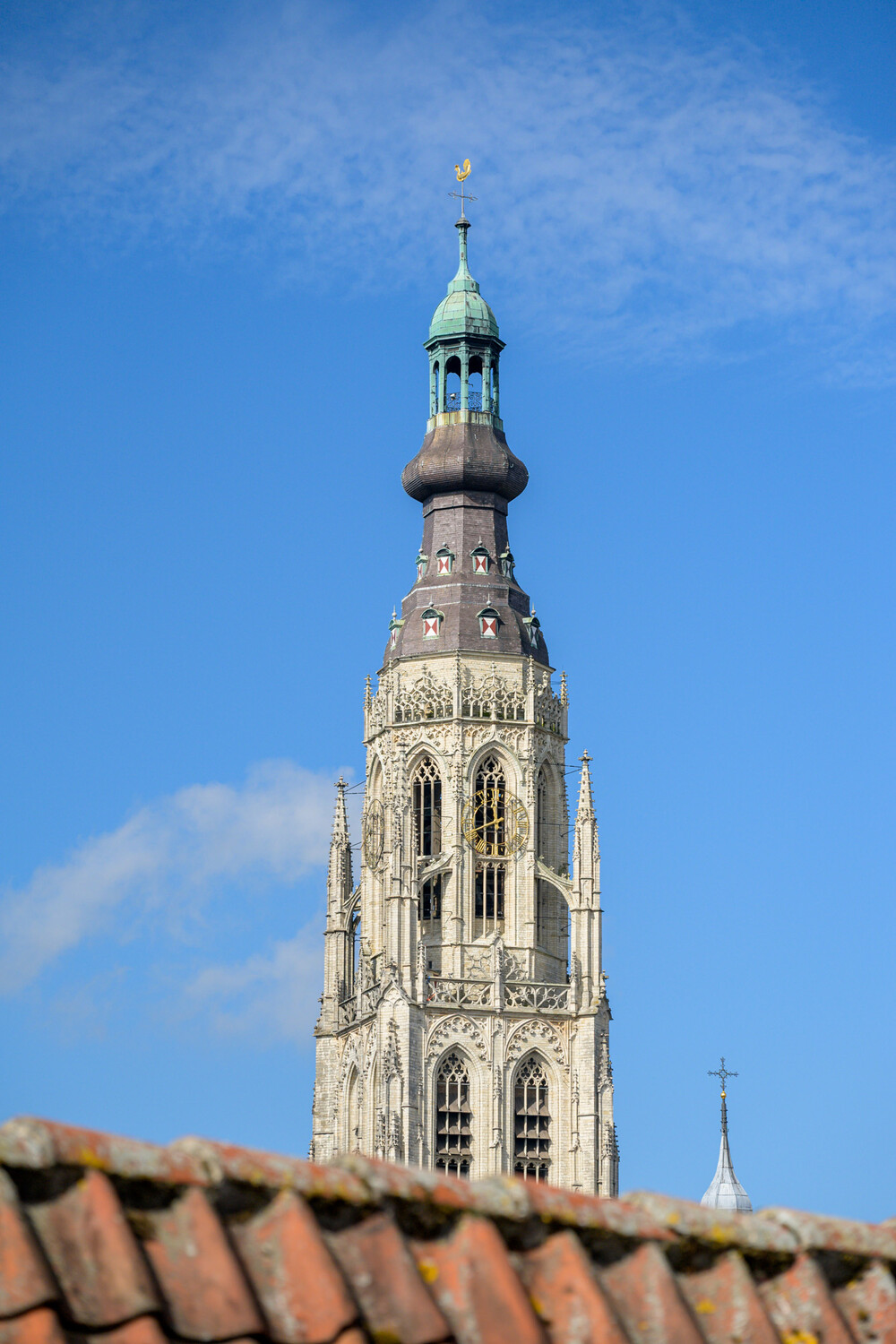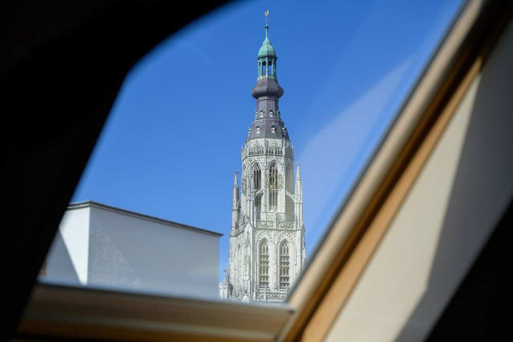 Heerlijk zonnig tweede terras, vanwaar o.a. zicht op de kerktoren van de Grote Kerk, het stadserf en vele historische geveltjes en daken van de binnenstad.