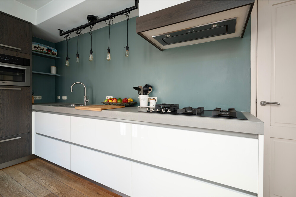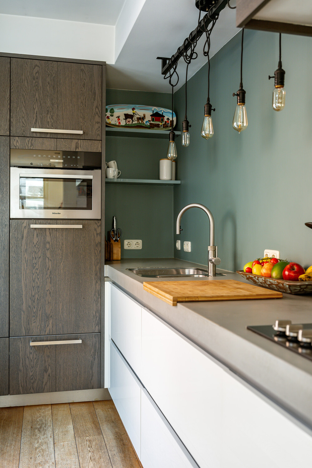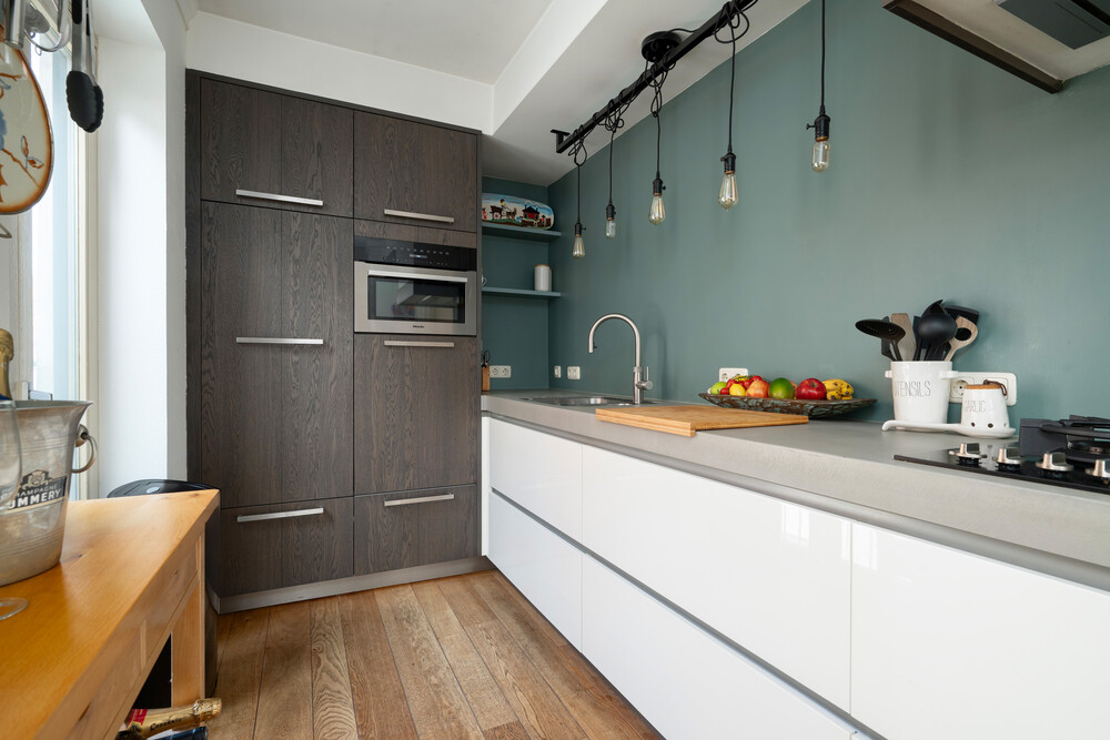 De half-open keuken grenst aan de woonkamer en is voorzien van een luxe inrichting in hoekopstelling, met o.a. een gecoat betonnen blad met 1½ rvs spoelbak, een brede 5-pits gaskookplaat, een afzuigkap, een koelkast, een Quooker, een vaatwasser op hoogte, een combi-magnetron en diverse kasten en laden.Vaste kast