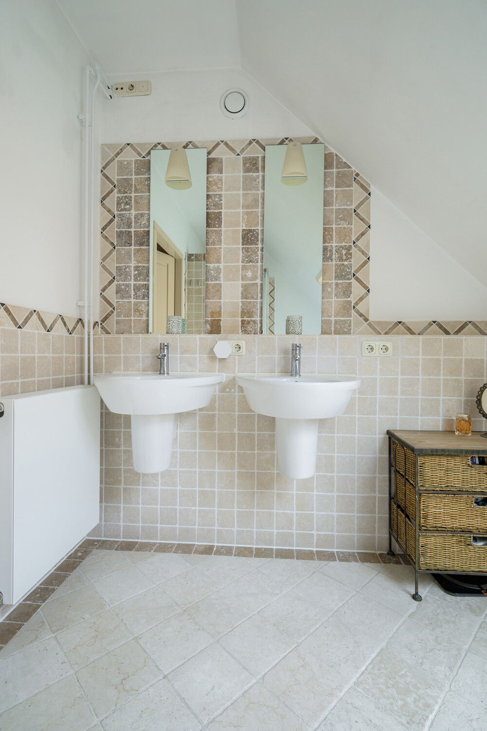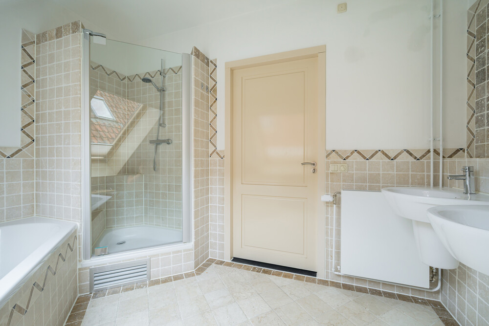 Badkamer met douche met thermostaatkraan, ligbad (whirlpool) en een dubbele wastafel. De badkamer is voorzien van natuurstenen betegeling.Hoofdslaapkamer