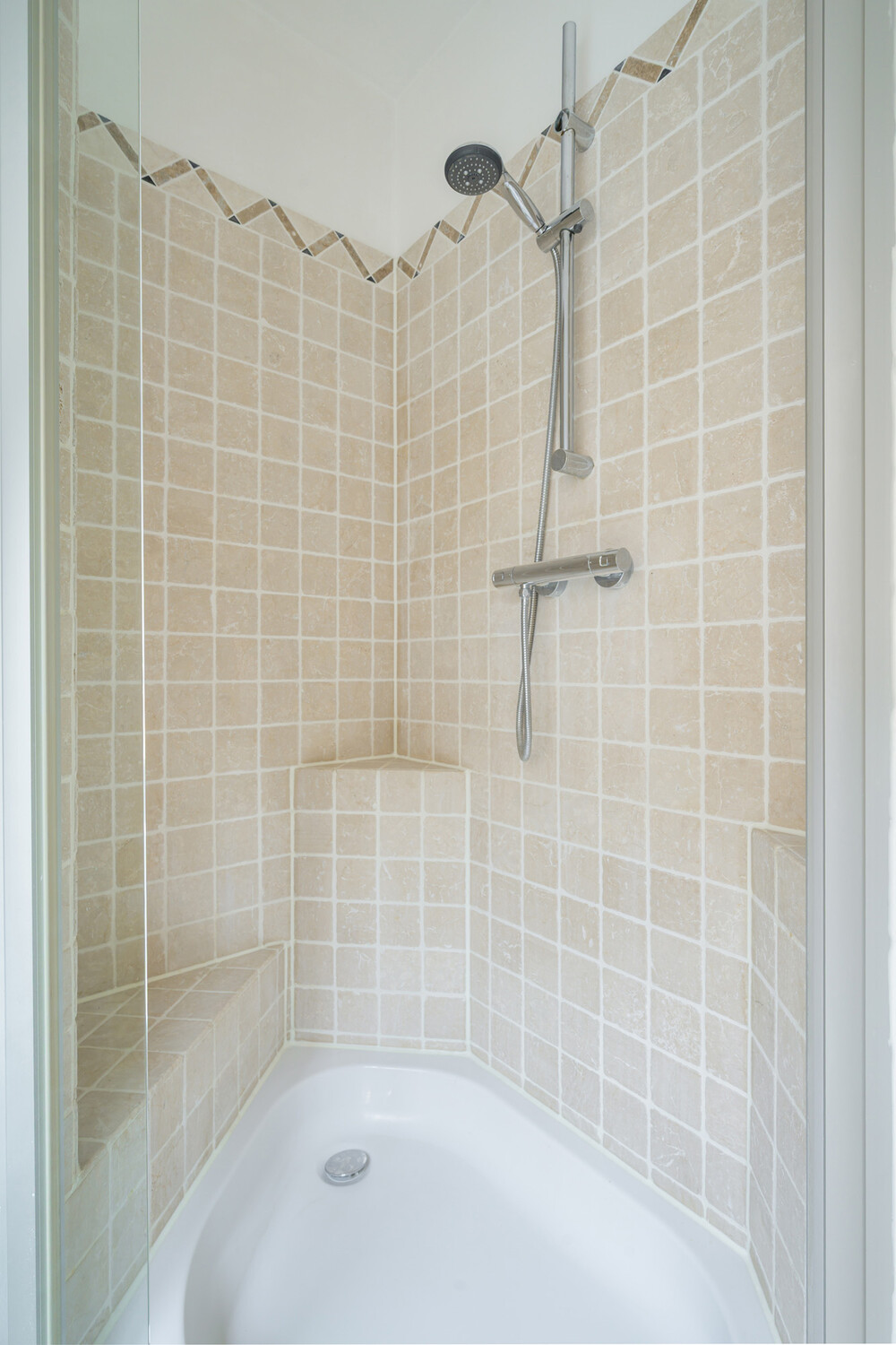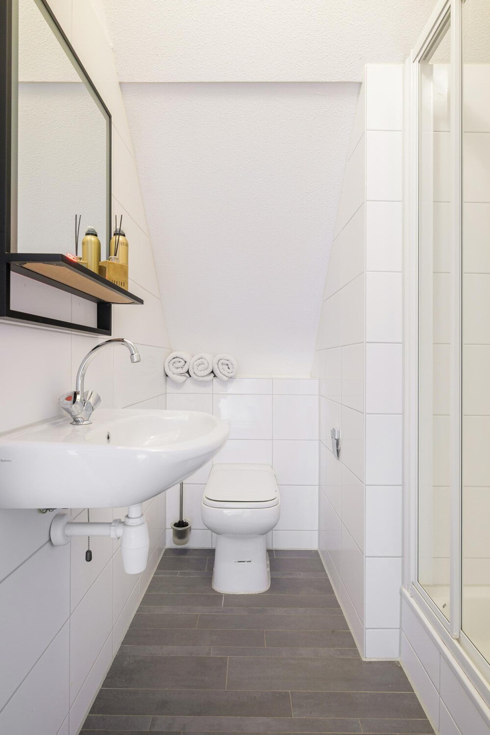 Tweede badkamer met douche met thermostaatkraan, toilet en wastafel.Terras ii