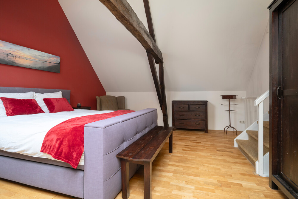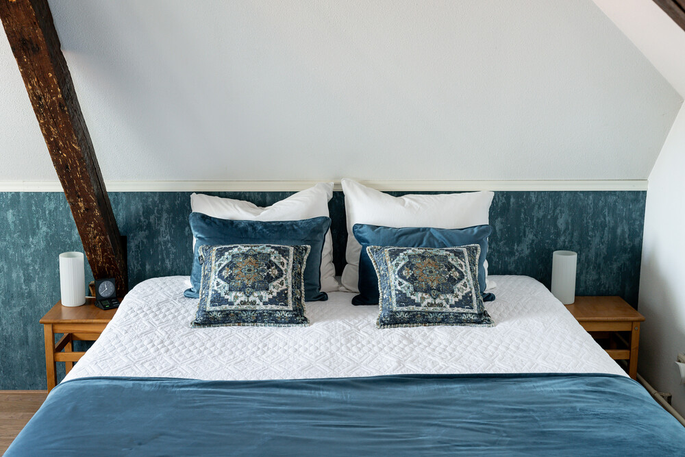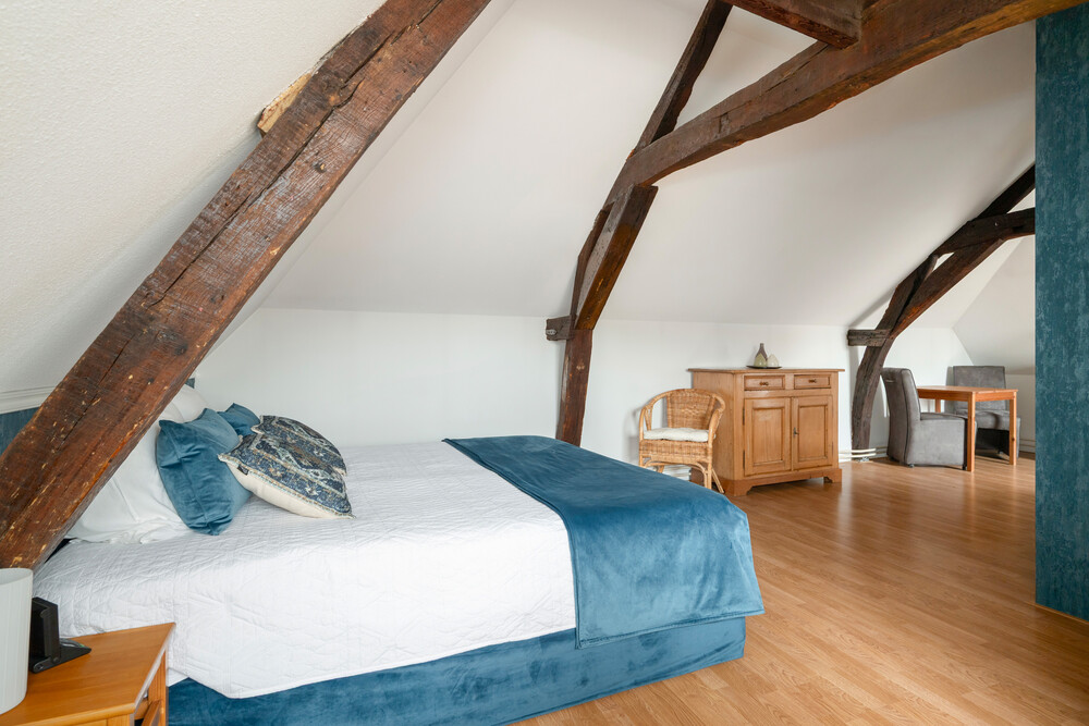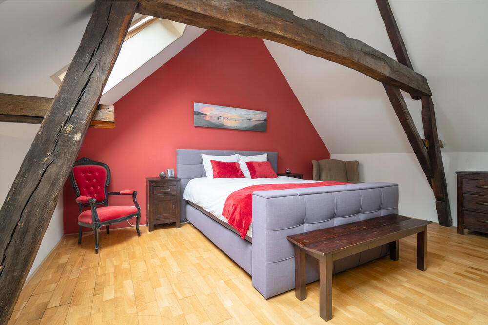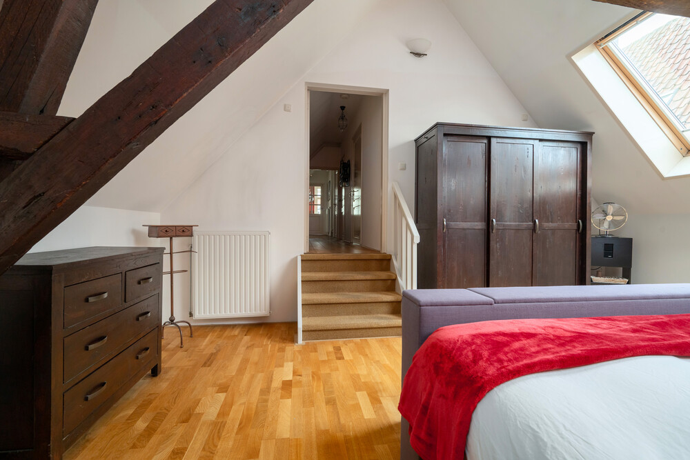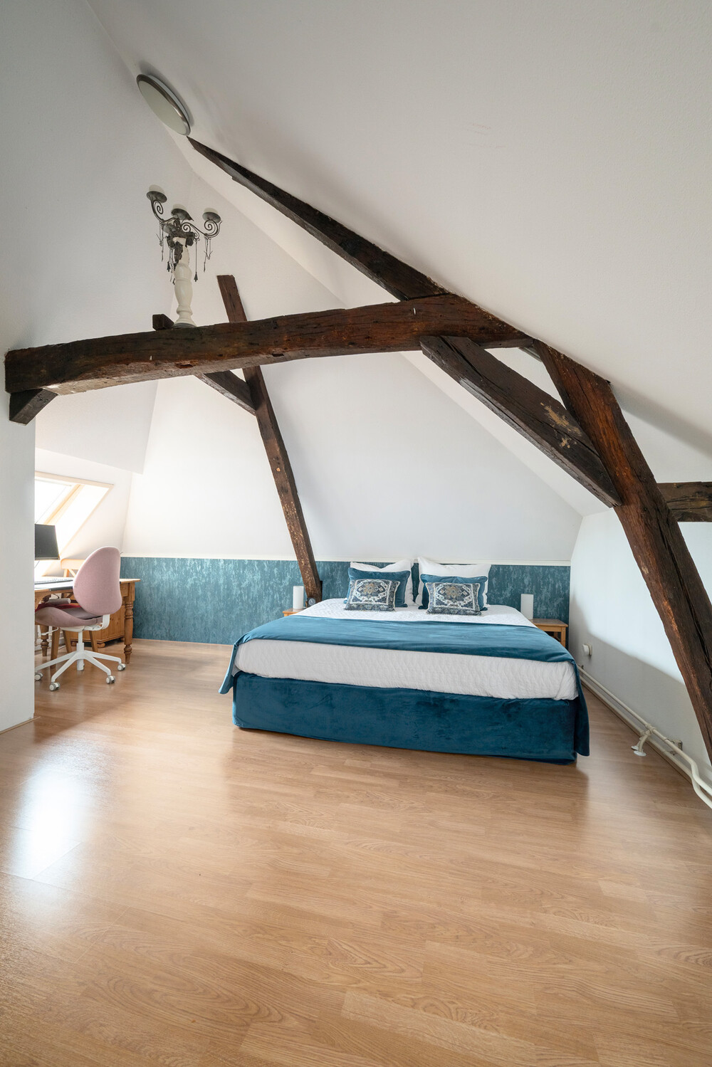 Riante hoofdslaapkamer met hoge nokhoogte en 2 grote Velux dakvensters voor ventilatie en daglichttoetreding. In deze kamer is de prachtige authentieke kapconstructie in het zicht gebleven. De vloer is voorzien van eiken lamelparket.