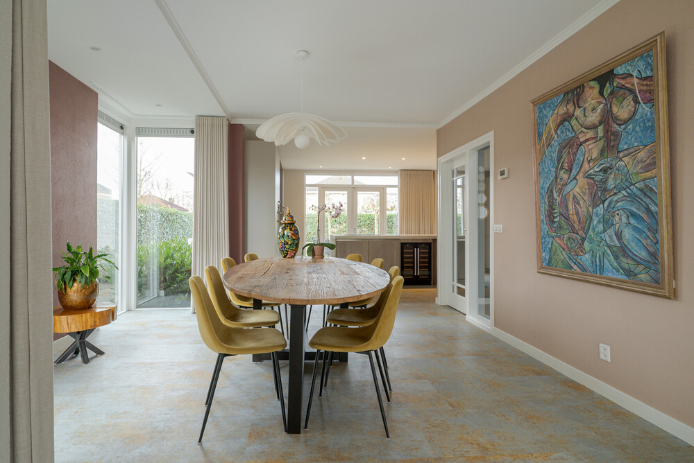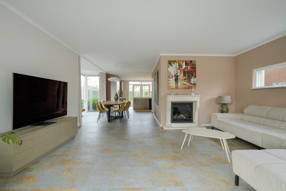 Royale en sfeervolle woonkamer met erker en uitzicht over de complete tuin is gelegen aan de voorzijde van de woning. De woonkamer heeft erg veel lichtinval door de vele raampartijen. Tevens beschikt de woonkamer, naast volledige vloerverwarming, over een schouw met gashaard, welke zorgt voor extra sfeer in de woning.Keuken