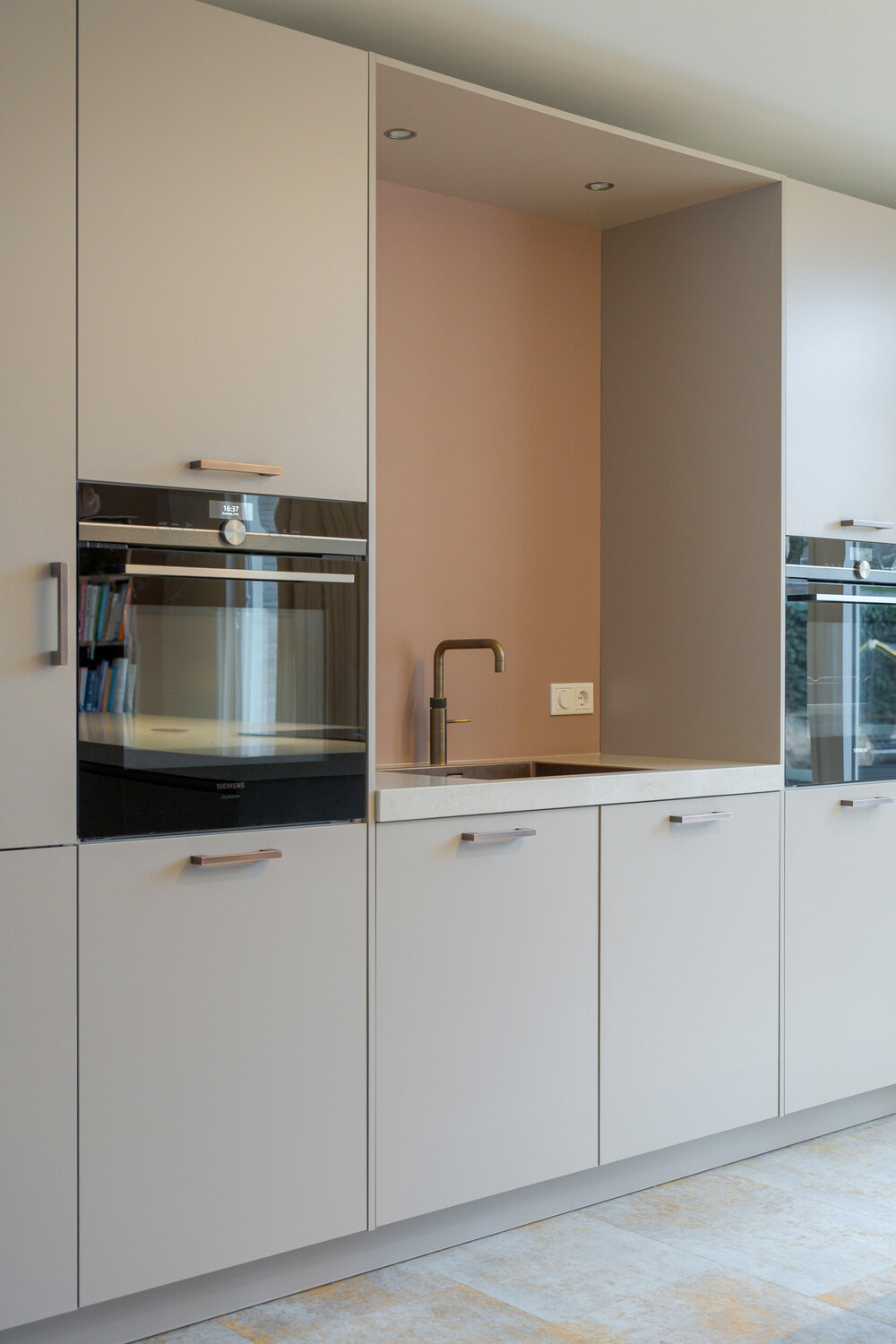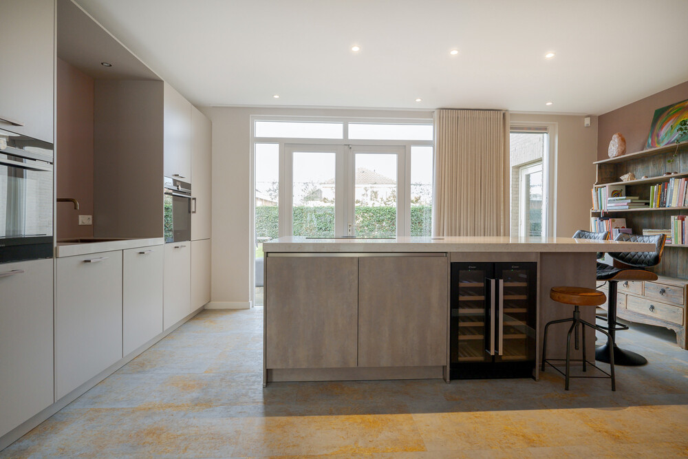 Deze luxe open keuken is gelegen aan de achterzijde van de woning en geeft middels openslaande deuren toegang tot de achtertuin en inpandig tot de garage. Deze keuken met kookeiland is voorzien van diverse onder- en bovenkasten, laden, een zelfreinigende combi-ovenmagnetron, een stoomoven, een koelkast, een vaatwasmachine, een spoelbak met Quooker, een BORA kookplaat, twee onafhankelijke klimaatkasten en een bar gedeelte.
