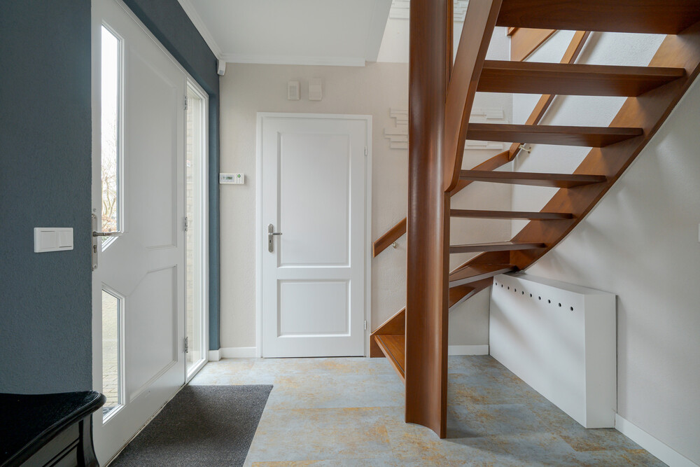 Ruime hal met toegang tot toiletruimte, meterkast, woonkamer en trapopgang naar verdieping I.Toilet