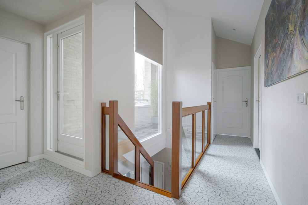 Overloop met toegang naar de loggia middels een loopdeur, de vier slaapkamers, een multifunctionele ruimte, de badkamer, een bergruimte en een vlizotrap naar de bergzolder.Badkamer
