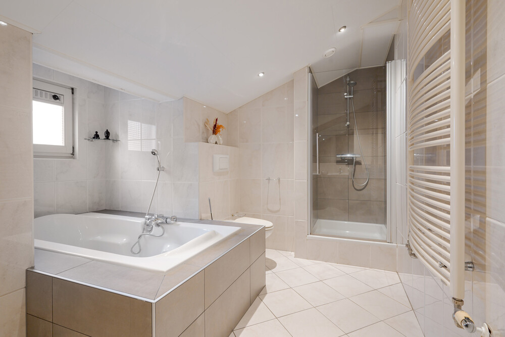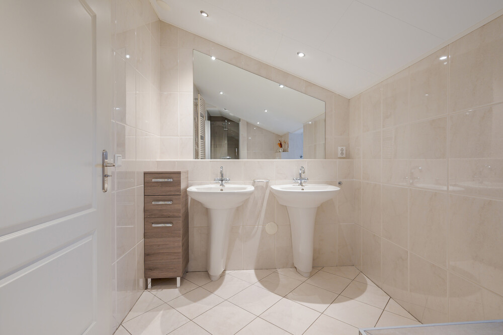 De geheel betegelde badkamer heeft een douche, een ligbad, een zwevend wandcloset, twee wastafels en een design radiator. Deze ruimte is tevens voorzien van inbouwverlichting.Slaapkamer i