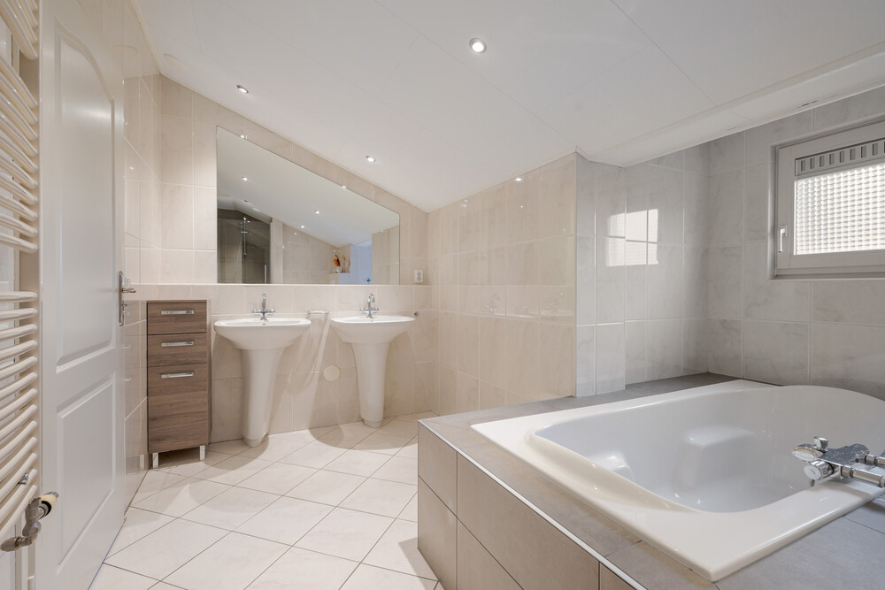 De geheel betegelde badkamer heeft een douche, een ligbad, een zwevend wandcloset, twee wastafels en een design radiator. Deze ruimte is tevens voorzien van inbouwverlichting.Slaapkamer i