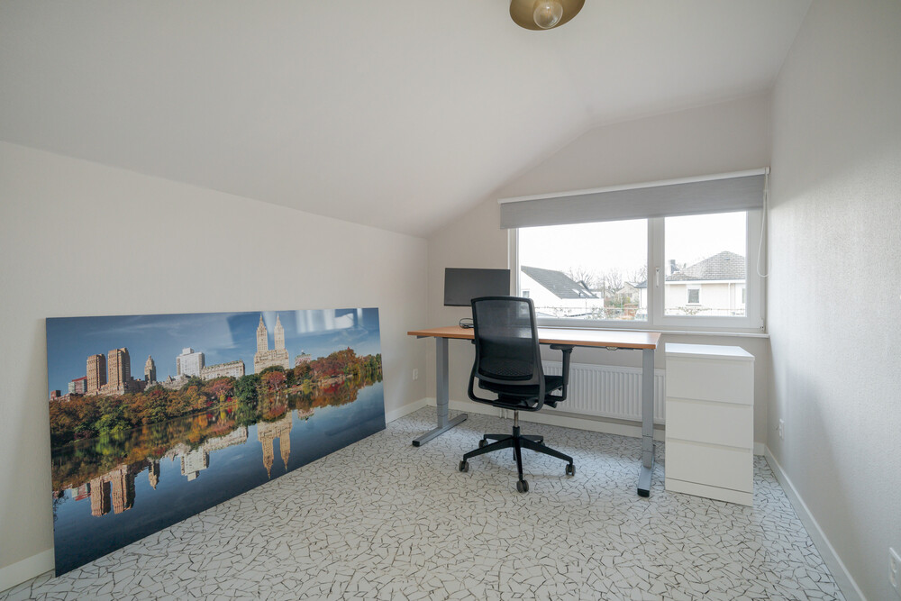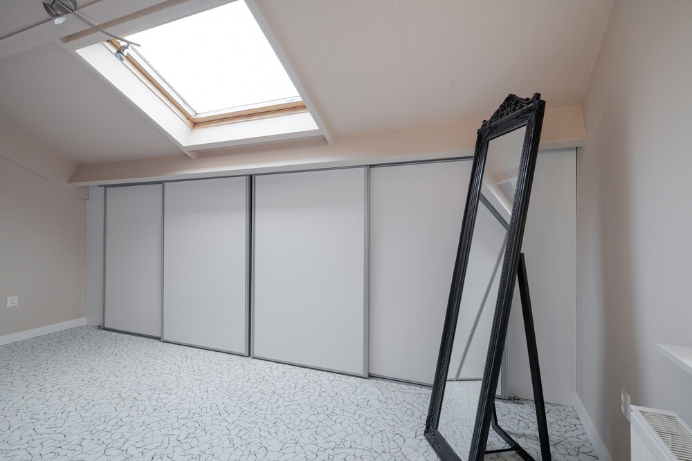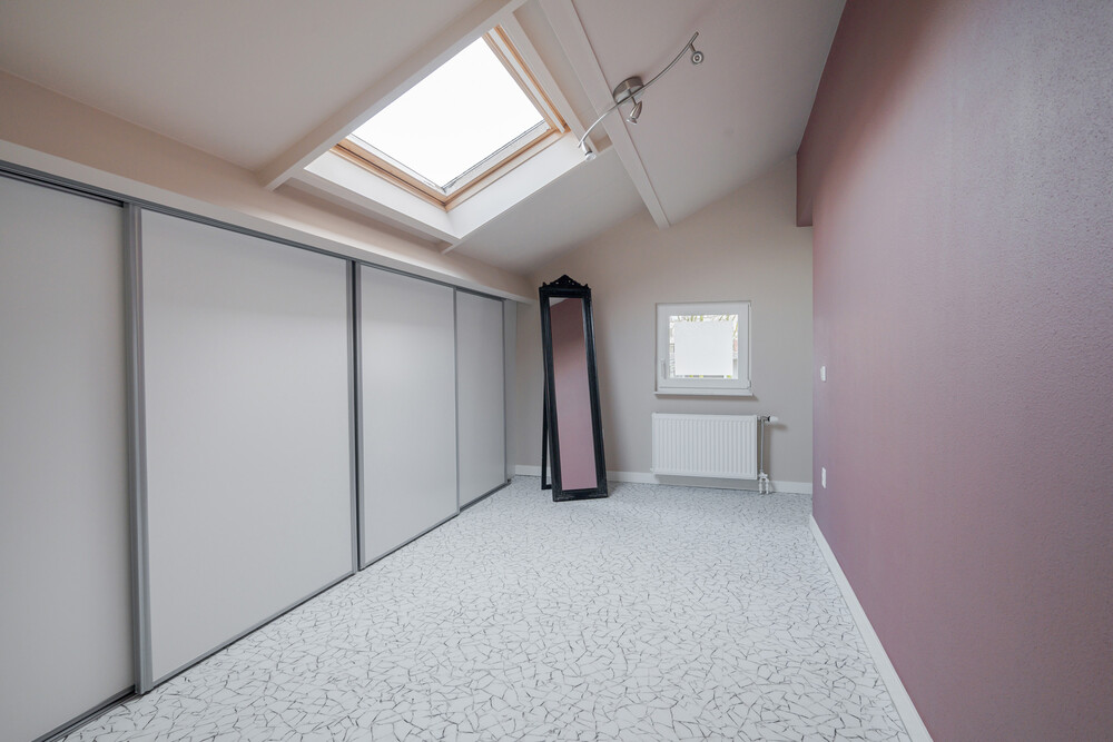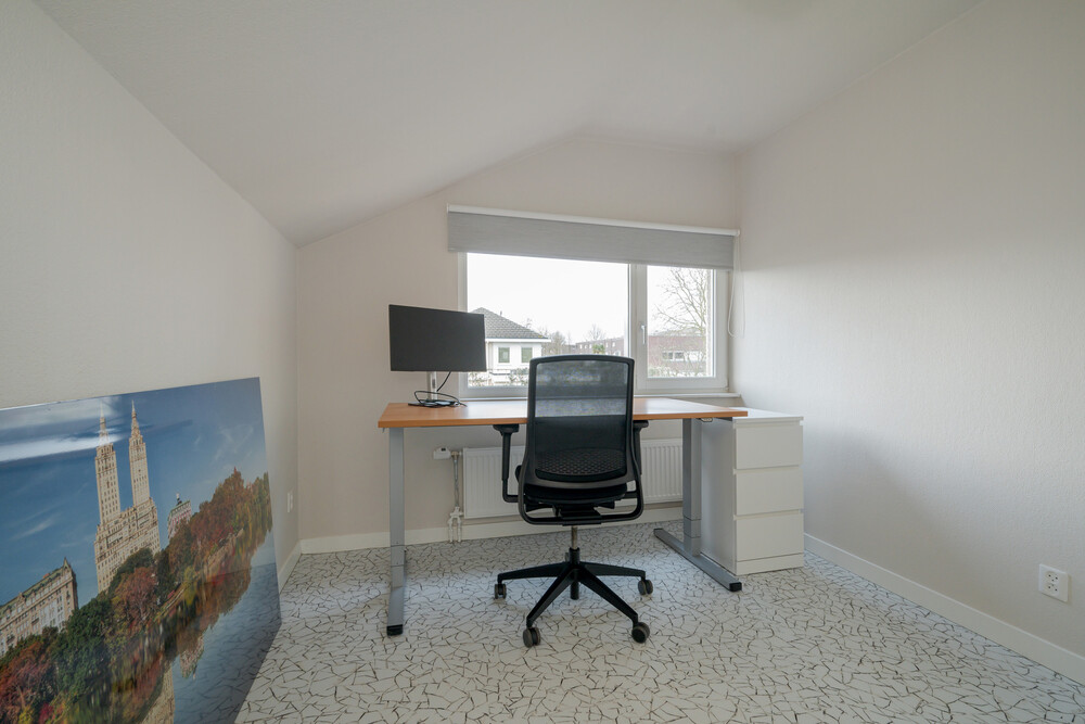 Multifunctionele ruimte boven de garage voorzien van een vaste kastenwand en een dakvenster. De ruimte is te gebruiken als prettige werkplek of speelkamer.Vanuit deze ruimte heeft u toegang tot de vierde slaapkamer.