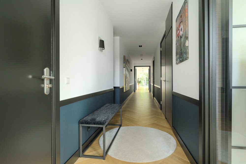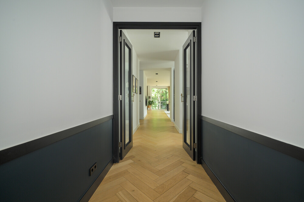 Entree met toegang tot gang. Vanuit deze sfeervolle gang, van maar liefst 25 meter, bereikt u de diverse vertrekken.Woonkamer
