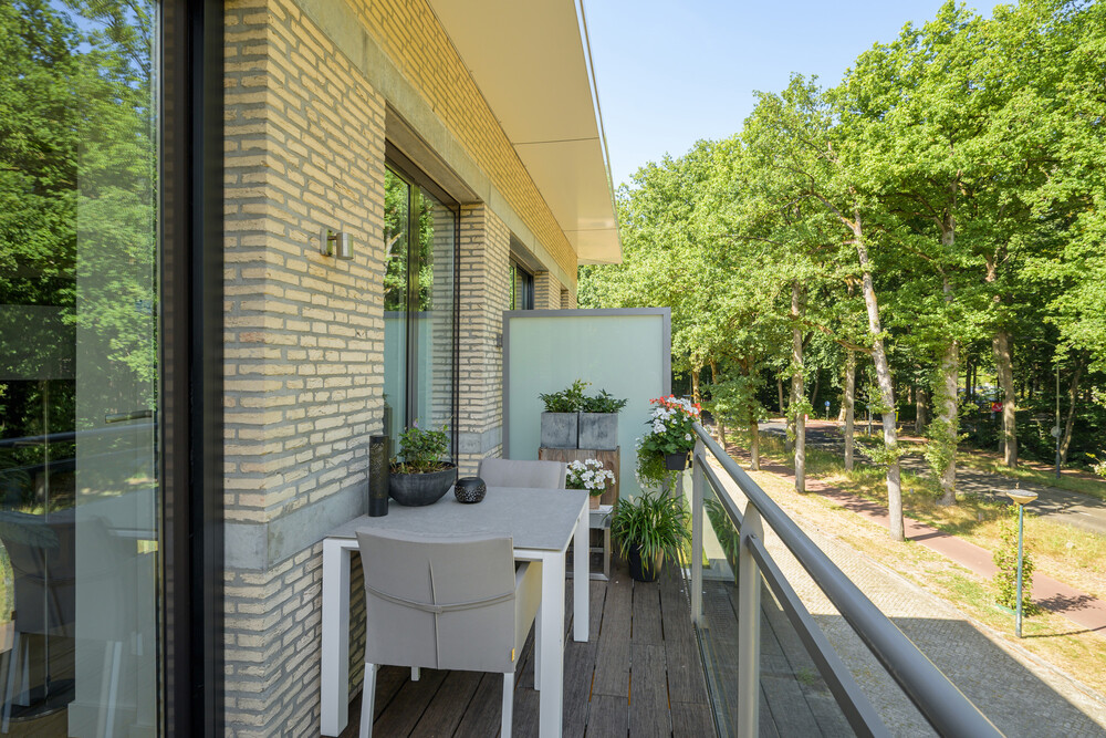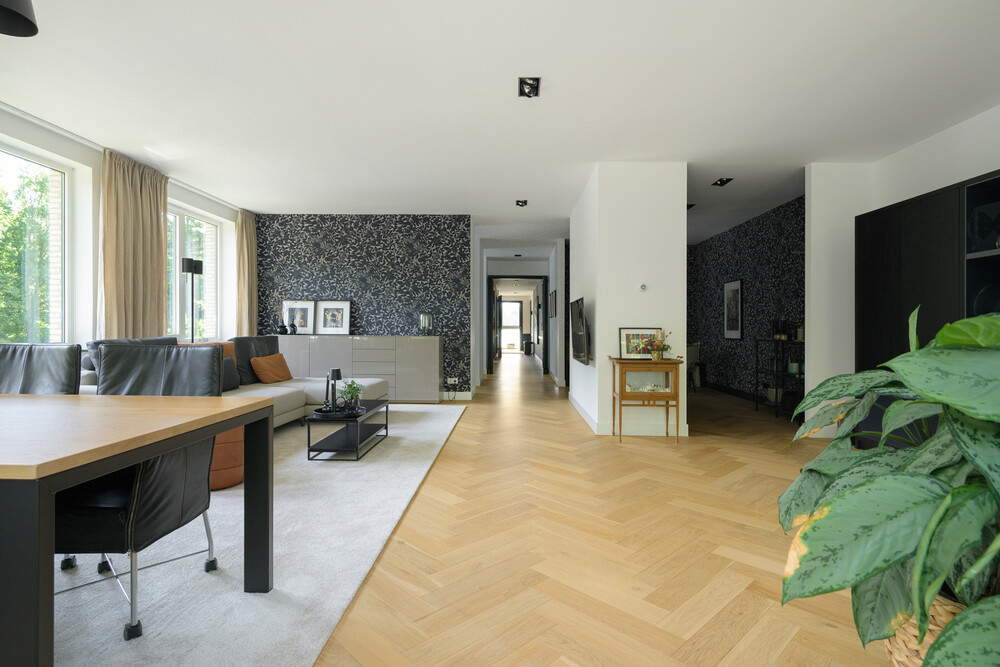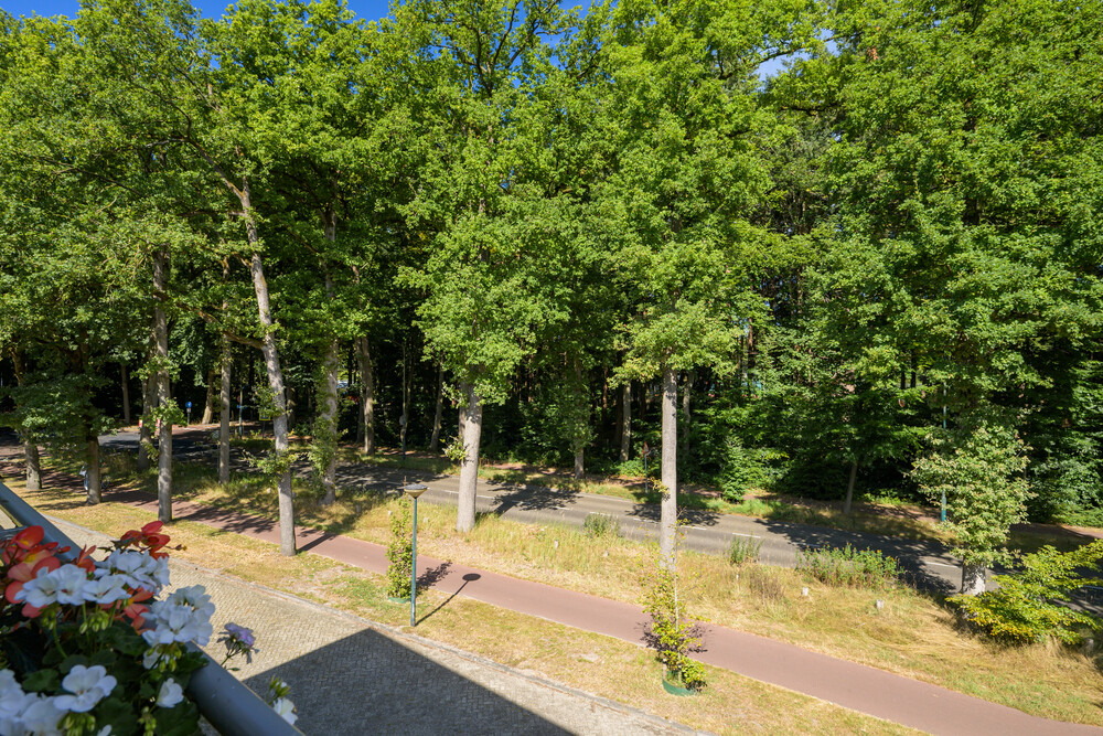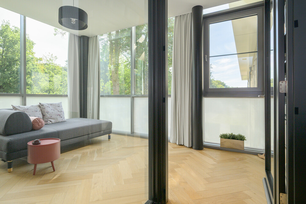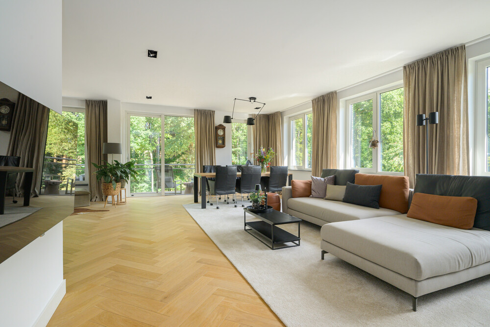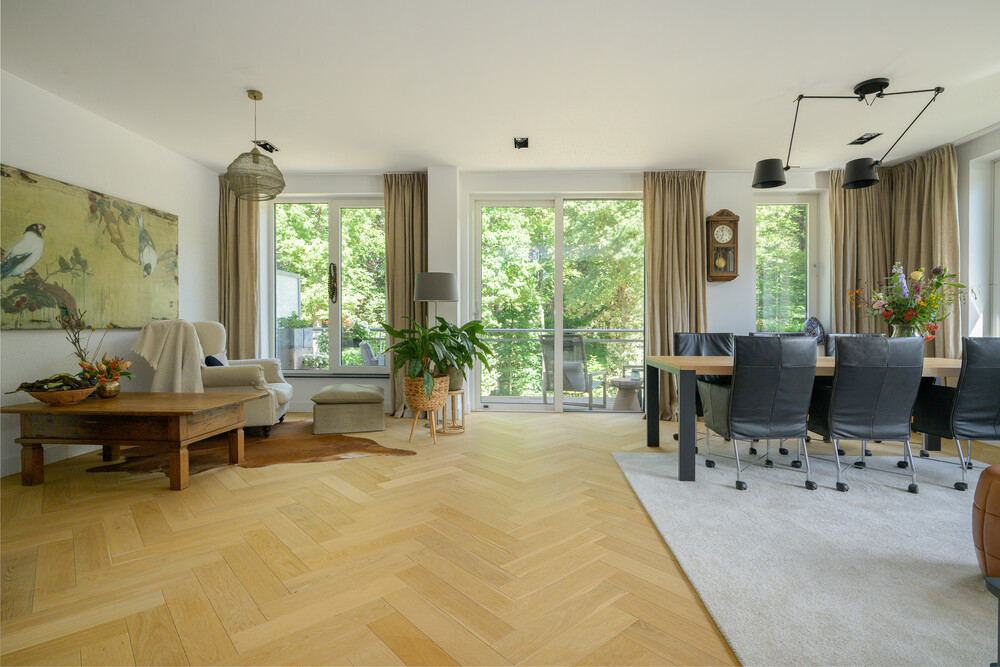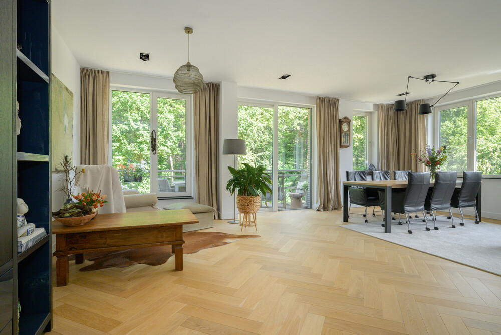 De woonkamer is aan het einde van de gang gesitueerd. Deze woonkamer is rondom voorzien van grote glaspartijen en u heeft een fantastische lichtinval en prachtig zicht op het rondom gelegen bos. Via een grote schuifpui bereikt u het brede balkon; dit balkon is uitgevoerd met fraaie lichte vloerdelen (bamboe).De woonkamer is verdeeld in een zitkamer- en een eetkamergedeelte.