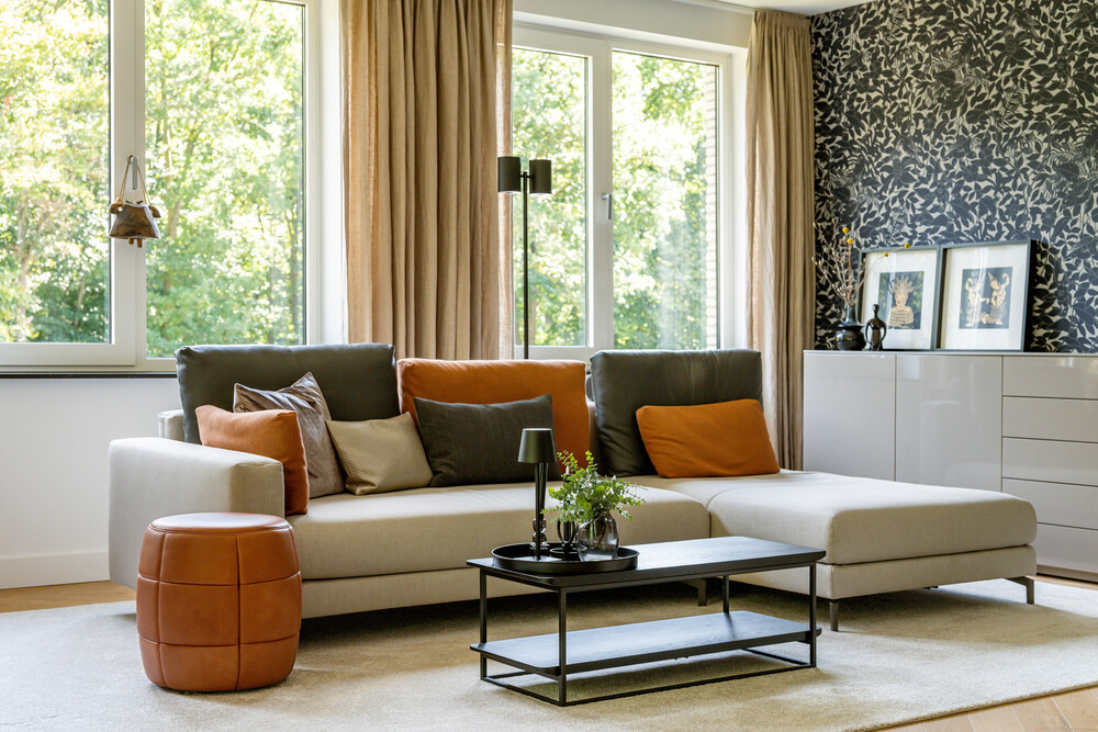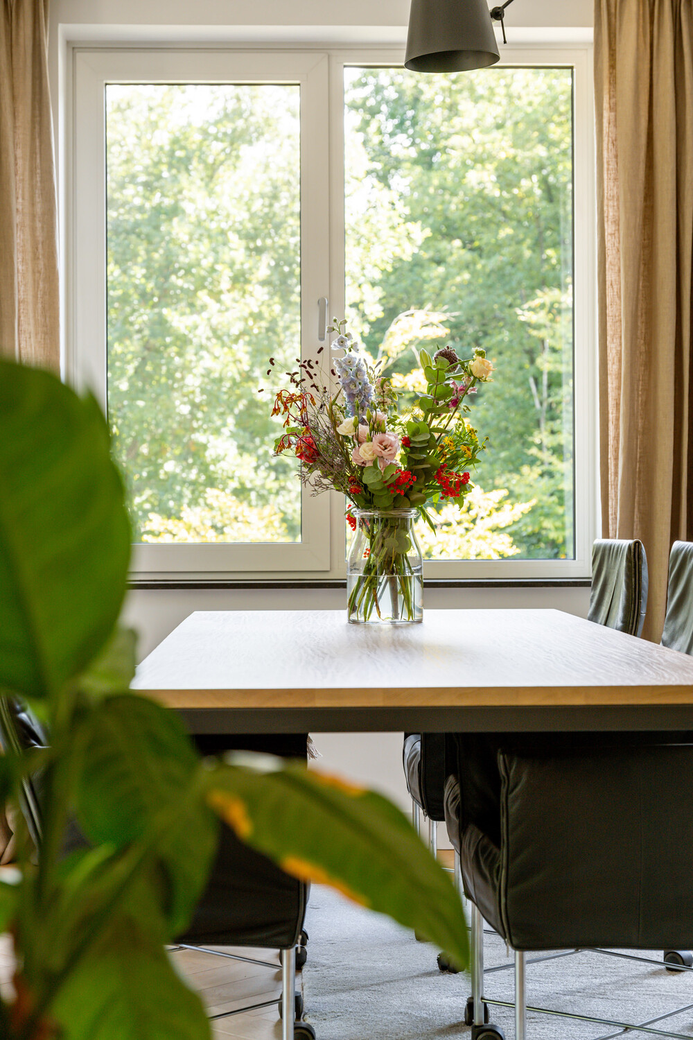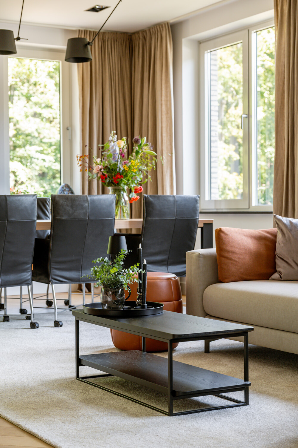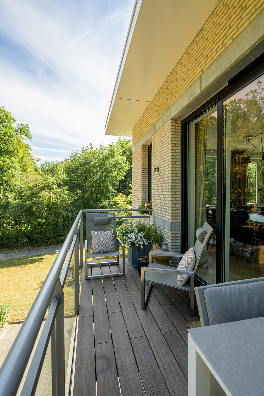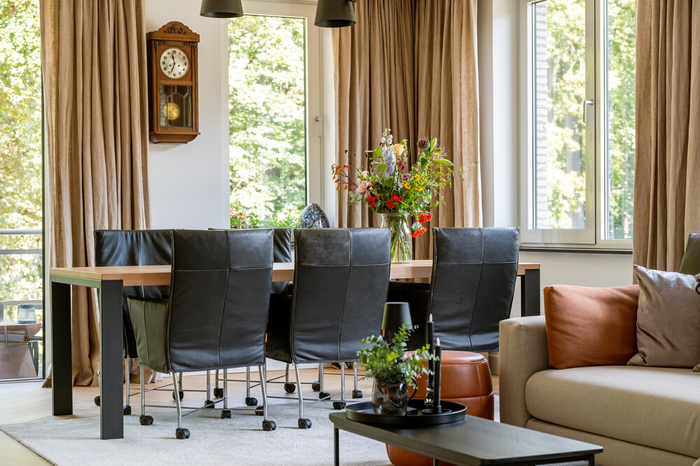 De woonkamer is aan het einde van de gang gesitueerd. Deze woonkamer is rondom voorzien van grote glaspartijen en u heeft een fantastische lichtinval en prachtig zicht op het rondom gelegen bos. Via een grote schuifpui bereikt u het brede balkon; dit balkon is uitgevoerd met fraaie lichte vloerdelen (bamboe).De woonkamer is verdeeld in een zitkamer- en een eetkamergedeelte.