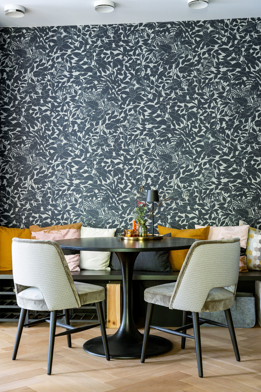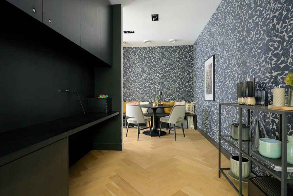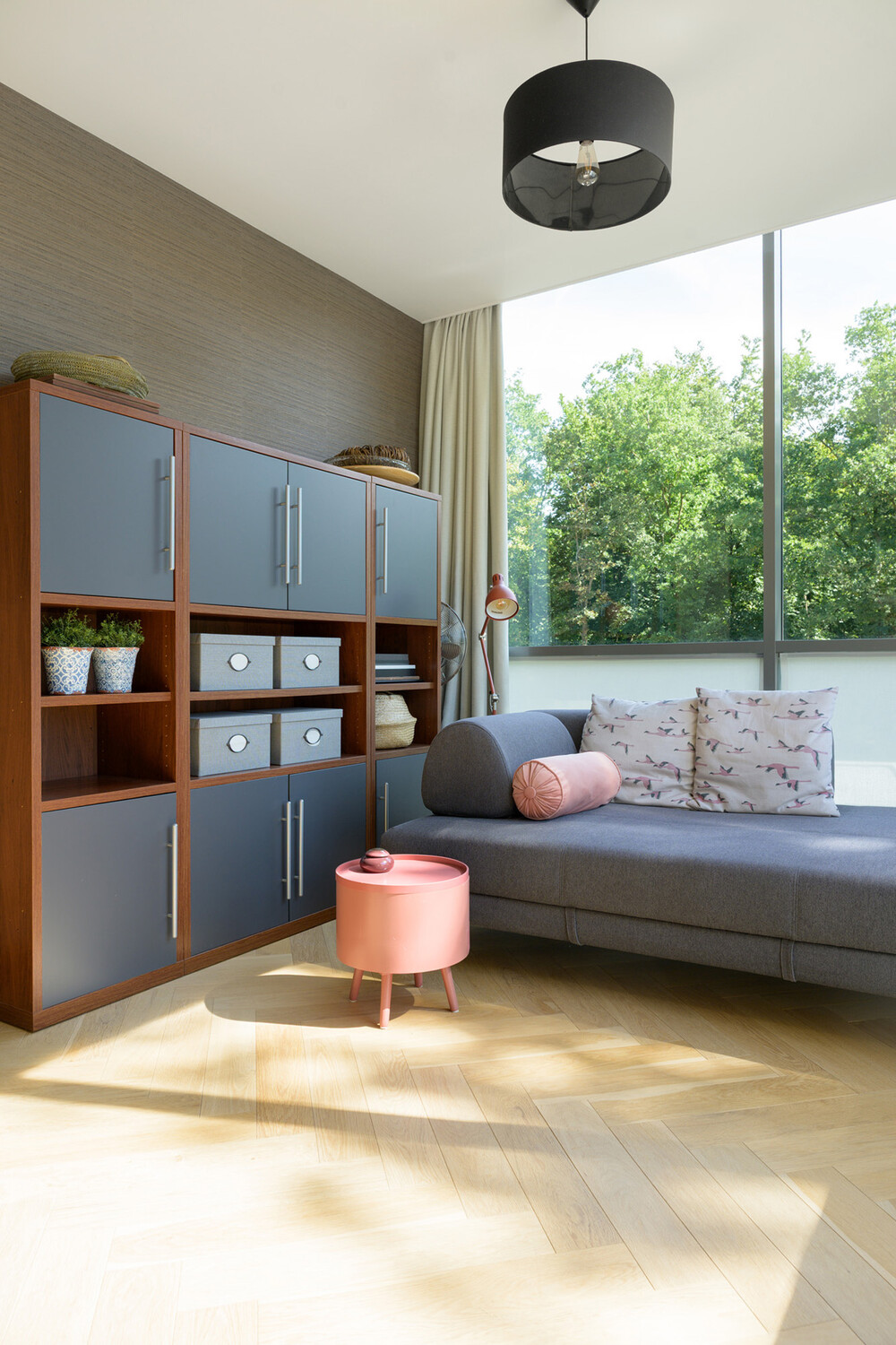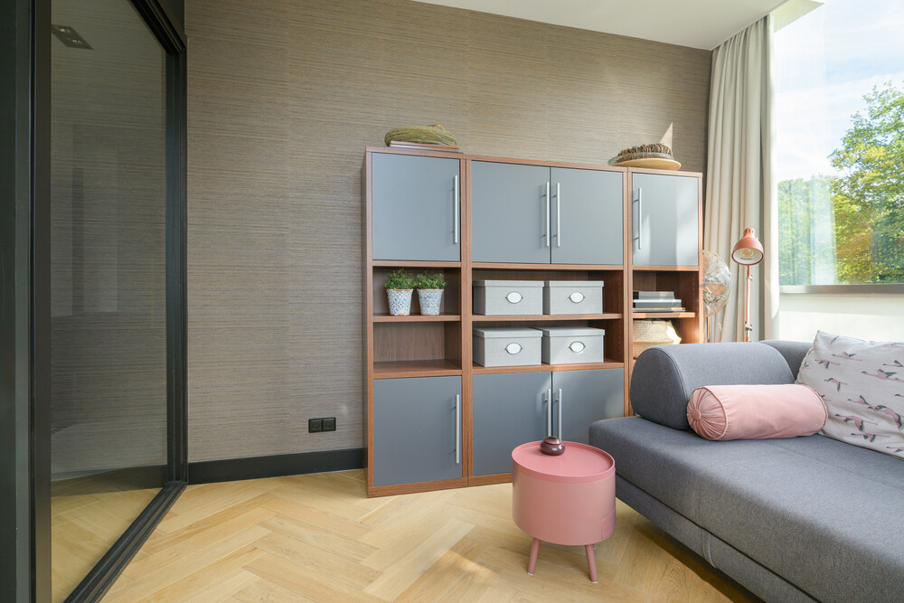 Achter een scheidingswand (waarin de aansluitpunten voor een televisie weggewerkt zijn) is bovendien een werkplek met een op maat gemaakt wandmeubel gerealiseerd. Ook is hier een extra zithoek aanwezig.