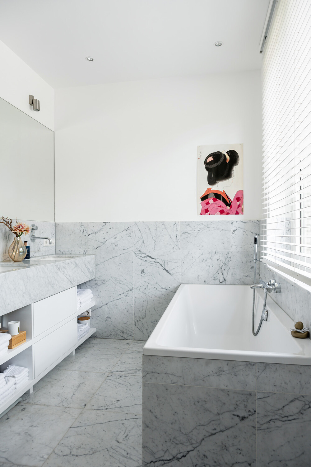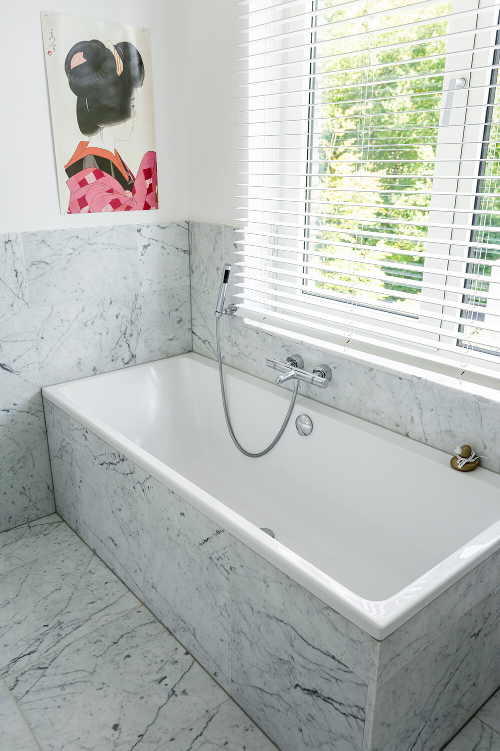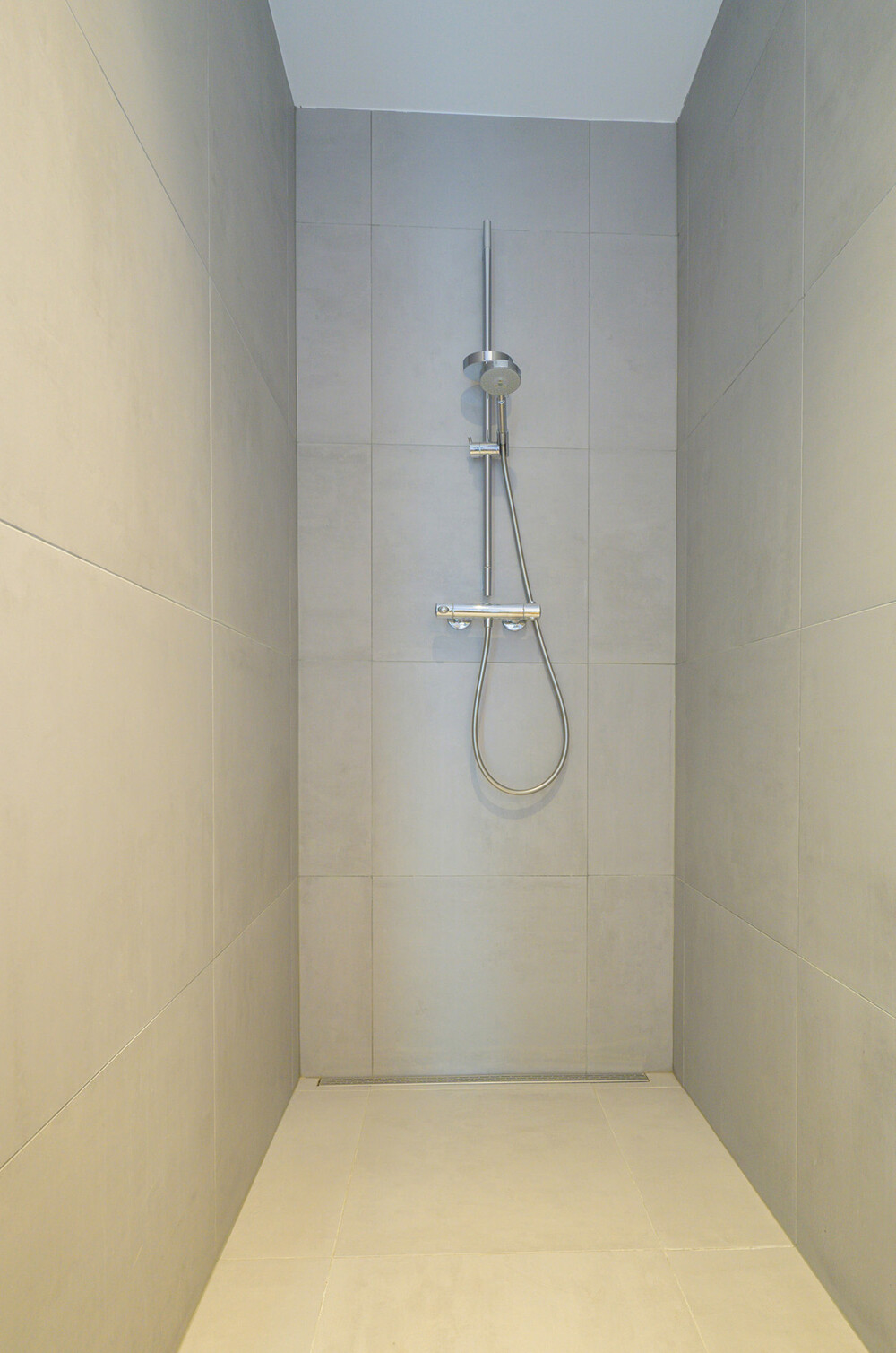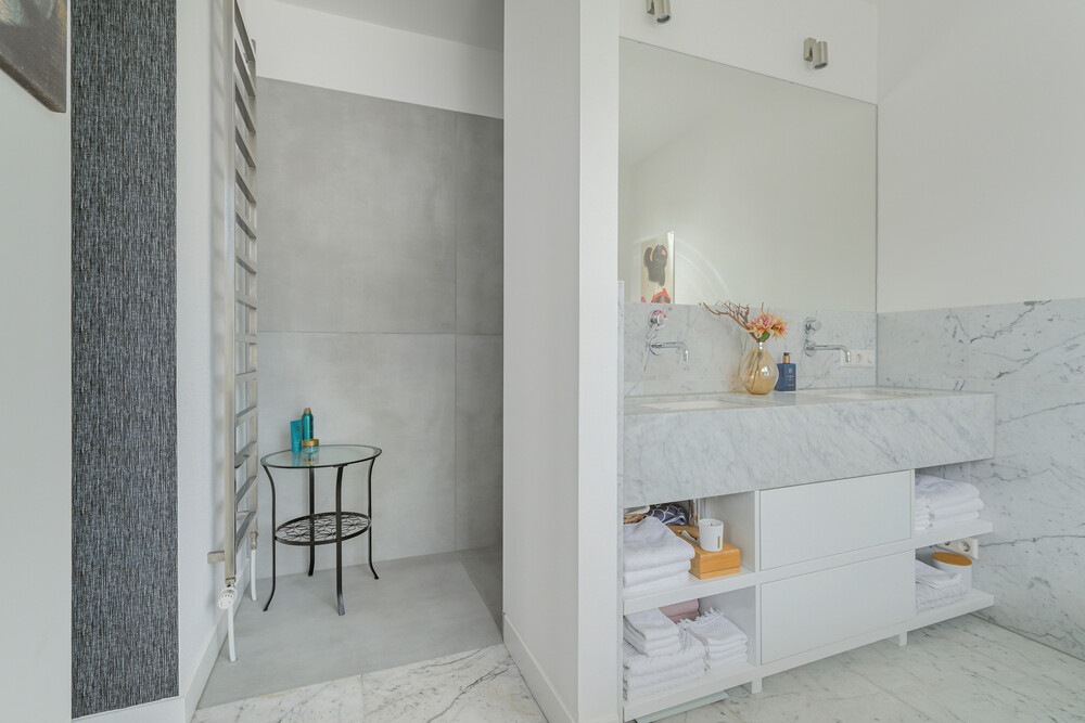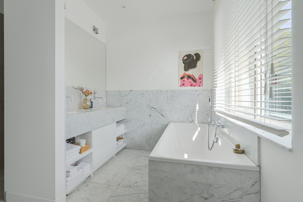 De badkamer is uitgevoerd met een luxe inrichting, bestaand uit natuurstenen betegeling, een wandcloset met inbouwreservoir, een inloopdouche met prachtige lichtgrijze 1.20m x 1.20m tegels, een wastafelmeubel met dubbele wastafel en een ligbad met thermostaatkraan.Wandmeubel waarin magnetron, oven en extra bergruimte.
