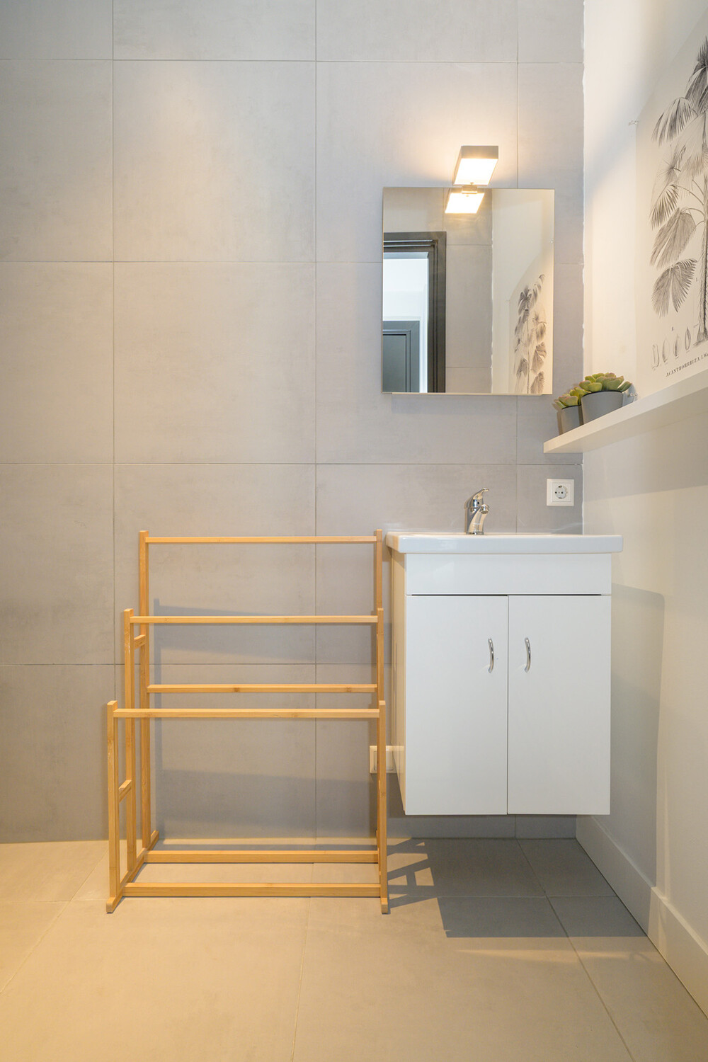Tweede badkamer voorzien van wastafel en inloopdouche.Meterkast