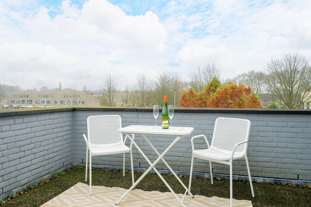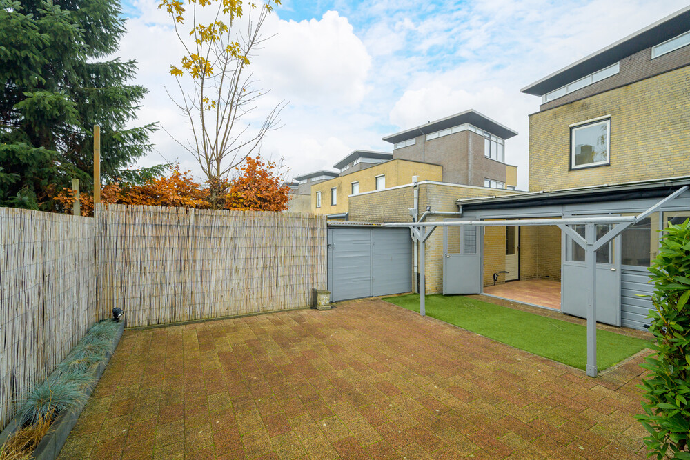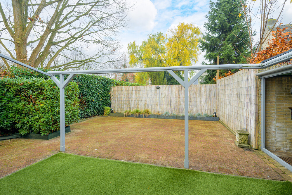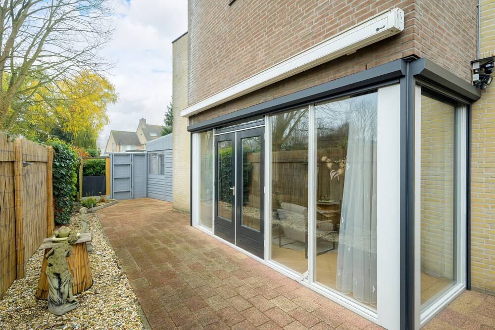 Zijtuin met een terras voorzien van een elektrisch bedienbaar zonnescherm en een open verbinding naar achtertuin.Achtertuin