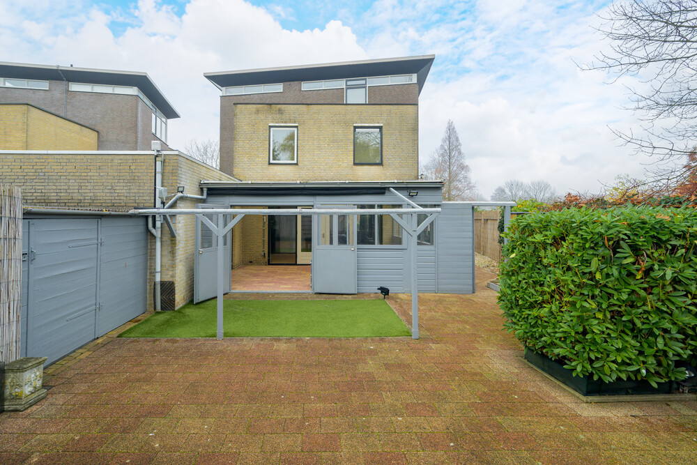 De aangebouwde eenvoudige houten serrekamer met stapdeur naar de garage en een stapdeur en dubbele deuren naar de tuin.