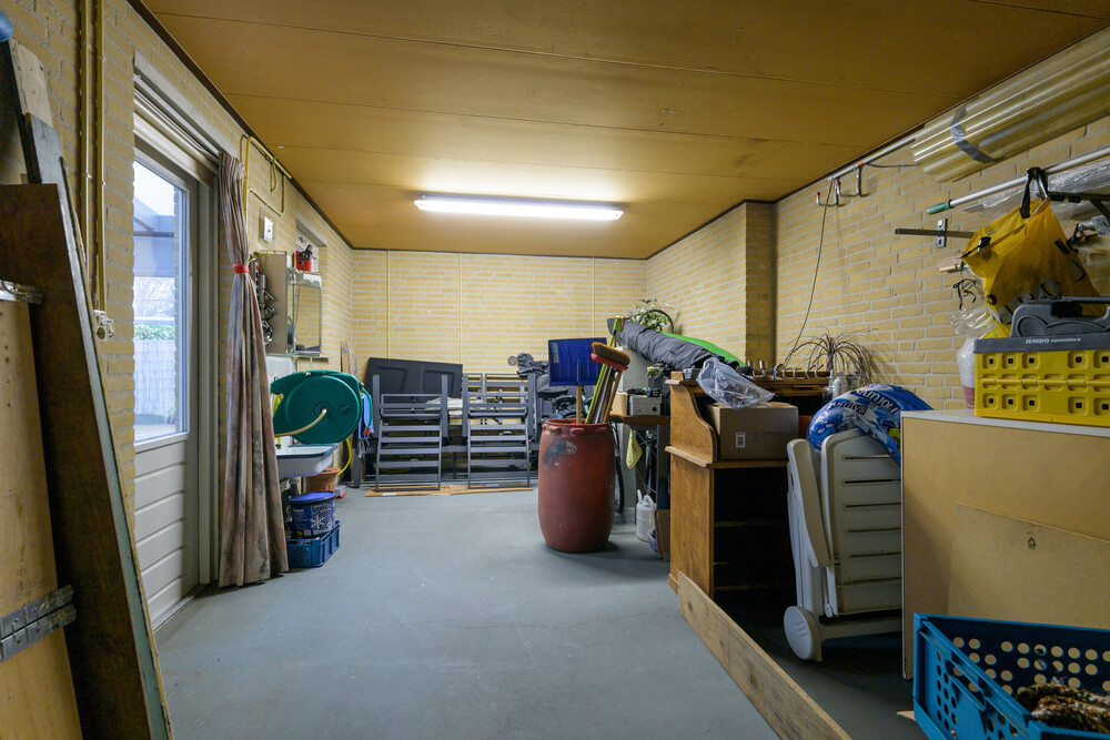De zeer ruime garage is bereikbaar via voornoemd portaal, een stalen kanteldeur met geïntegreerde stapdeur vanaf de oprit en via een stapdeur vanuit de tuinkamer. De garage is voorzien van elektra, verwarming, een gootsteen en voorts bevinden zich hier de aansluitingen t.b.v. de wasapparatuur.Serre