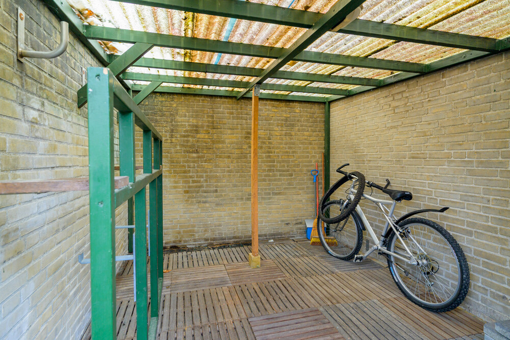Oprit voor het parkeren van 2 personenauto's en een open verbinding naar de voortuin die is aangelegd met borders. Via een poort is de zijtuin bereikbaar.Zijtuin